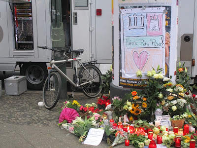 Do outro lado da rua, o passeio estava parcialmente fechado. Uma polícia recolhia as flores e velas das pessoas, e ia pondo junto ao cartaz "Même pas Peur!"