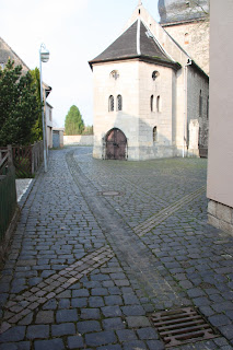 (Esta calçada foi feita por portugueses. A população queria asfalto, mas os arquitectos urbanísticos disseram que o centro histórico tinha de ter um pavimento mais nobre, e pediram a quem sabe. Portugueses. Está bonito e muito bem feito. Mas quando neva ou há gelo, a velhinha de oitenta anos com quem falei não sai de casa. Tem demasiado medo de escorregar nas pedras lisas.)