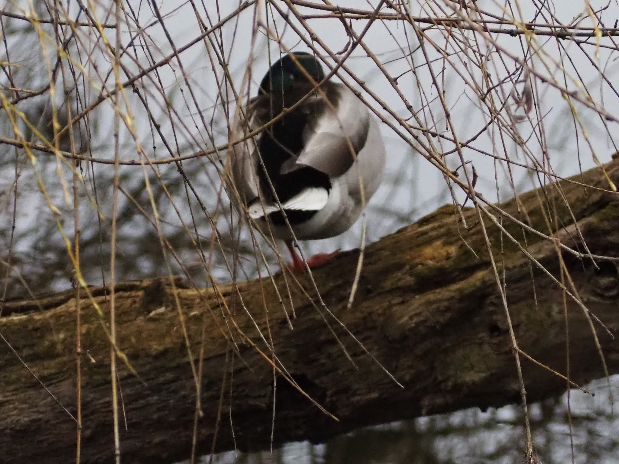 Chovia um pouco, e dei com três patos alinhados num tronco caído, reflectidos na água. Três vezes dois, seis. Quem me dera que o dia estivesse de sol, ia ser uma fotografia bem gira. O problema é que se o dia estivesse de sol, eles não se abrigavam naquele sítio.