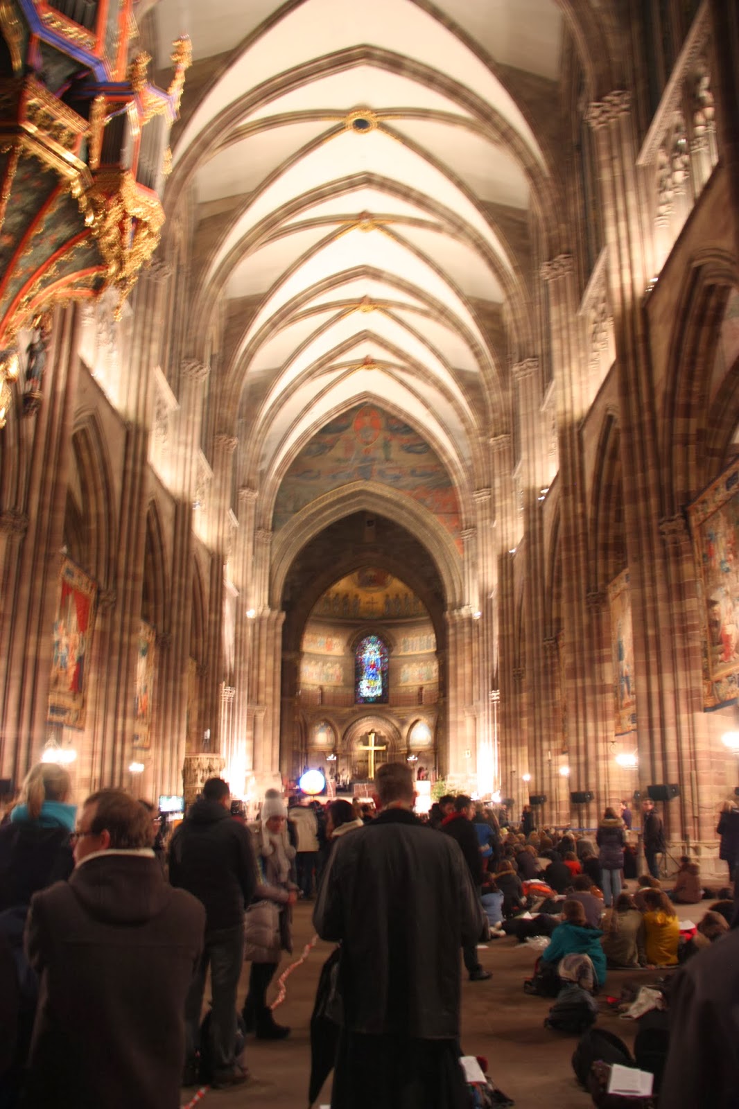 No dia 28 fomos de novo a Estrasburgo, para a primeira celebração do Encontro Europeu da Comunidade Ecuménica de Taizé. Tínhamos apalavrado um encontro com amigos de Lisboa, mas eles optaram por ficar no pavilhão do Irmão Alois, e nós, que nem sabíamos onde era o tal "Wacken" do sms deles, preferimos ir à oração na catedral: queríamos sentir aqueles cânticos familiares a ecoar entre as paredes quase milenárias. Tirei algumas fotografias jurássicas da pobre Estrasburgo sob uma chuva copiosa, e entrámos. Éramos os primeiros, sentámo-nos bem à frente. Daí a bocado chegou um grande grupo, que se instalou ao nosso lado, e alguém exclamou "olha os nossos pais!" - eram os oito portugueses que ficaram na nossa casa, no encontro de Berlim há dois anos. Logo a seguir, a Christina descobriu que estava sentada atrás de uma alemã com quem trabalhou na Bolívia. Sabíamos que eles estariam nesse encontro, mas nunca poderíamos imaginar que, sem combinar nada, iam decidir sentar-se na mesma igreja e no mesmo sítio que nós. A Christina ria-se muito com uma das nossas "filhas": também a tinha encontrado absolutamente por acaso nas Jornadas Mundiais da Juventude no Rio de Janeiro. Logo ali confessei que às vezes suspeito que Deus existe e gosta de nós. Concordaram todos, no meio de muitos sorrisos.