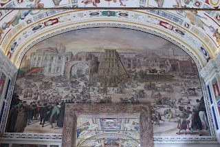 Seguidamente, tentei encontrar as bibliotecas, mas só dei com as salas. Lindas, lindas. Essas salas mereciam bem um dia, para saborear cada uma delas e para identificar as cenas pintadas nas paredes. Como esta, contando os esforços de mover um enorme obelisco umas centenas de metros, porque o queriam exibir na praça da catedral de São Pedro.