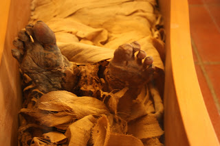 Havia uma múmia desembrulhada. Uma mulher, morta há mais de 3.000 anos. Deitada dentro da caixa, junto à respectiva tampa ricamente decorada: pele muito castanha, caracóis colados à pele da cabeça, as mãos muito esguias esticadas lado a lado, panos no lugar dos olhos, e um ar desolado. Encheu-me de tristeza e respeito. Tinha há muito tempo a curiosidade de ver uma destas múmias, mas o que encontrei foi uma mulher despojada e à mercê do nosso voyeurismo.