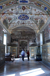 Para visitar os museus do Vaticano pode-se comprar o bilhete na internet, mas eu confiei na minha boa estrela. E fiquei sabendo que a minha boa estrela mete folga nas manhãs de sábado. Mas deixa algum substituto a prestar serviços mínimos: na fila, de uns bons trezentos metros (não percebo nada de distâncias, estava capaz de dizer que eram dois quilómetros, mas ficamos assim), só precisei de uma hora para chegar à bilheteira. A ver se contam o truque ao meu banco, que às vezes espero uma boa meia hora para que aviem três ou quatro pessoas à minha frente (talvez esteja a exagerar um pouco).