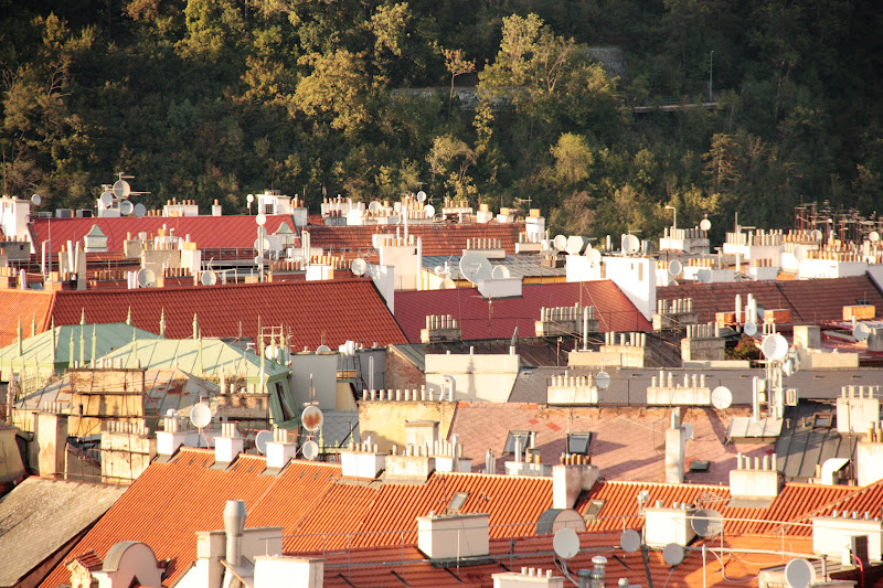 Começámos pela praça central (a Staromestské námestí - vou ter de escrever os nomes sem os acentos circunflexos invertidos) da cidade velha (Staré Mesto). Subimos à torre da Câmara, o melhor sítio para entrar na cidade: de lá se vê o burgo com a sua catedral, do outro lado do rio,