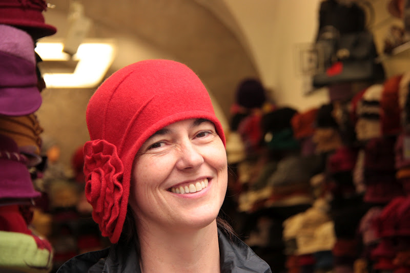 Alguns metros à frente encontrámos uma loja de chapéus. Chapéus de todas as cores e formas, quase todos com design checo e 100% lã. Experimentámos alguns, e quando perguntei em inglês se tinha chapéus tipo anos vinte, assimétricos, responderam-me em português! Não há dúvida: somos mais que as mães!
