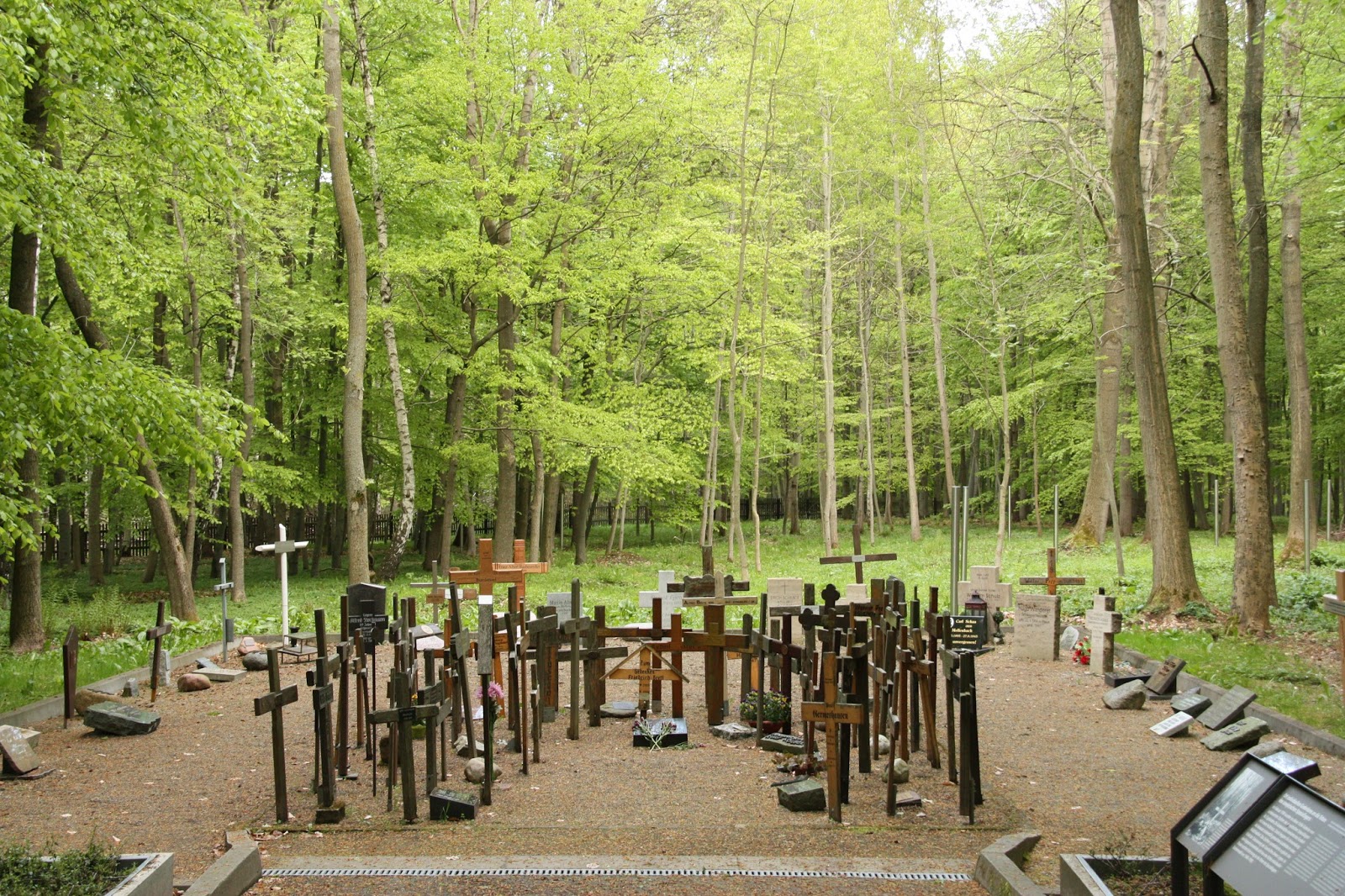 Ao fundo do campo, perto do edifício com a exposição dedicada às vítimas do campo de concentração reaberto pelos russos, há na floresta um enorme memorial: barras de metal entre as árvores, assinalando corpos sem nome.