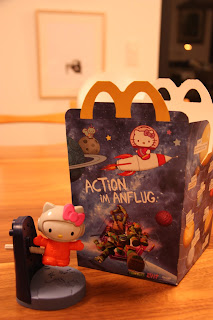Hoje estive na Potsdamer Platz, e aproveitei para experimentar uma happy meal alemã, já que entretanto sabemos como é em Portugal e no Texas. Tive alguma vergonha de pedir um pacote para crianças (quantas vezes não me lembrei já de fazer isso no restaurante da IKEA!) (mas nunca fiz, por causa do "maldito inquilino", como naquela tira da Mafaldinha), mas lembrei-me que era um estudo sociológico e ganhei coragem. Cientista sofre!, que o diga a Madame Curie.
