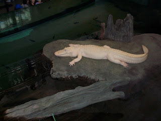 Em compensação, o aquário é formidável, embora demasiado cheio. E na secção dos pântanos tem o que parece ser uma grande pirosice, um crocodilo branco feito de plástico ou talvez cerâmica, e que é afinal um raríssimo aligátor albino. Se não tivesse visto com estes que a terra etc., não acreditava. Ali estava ele imóvel, e nós tambem, tentando adivinhar de que material seria feito, e eis que de repente o bicho abre a bocarra e começa a espreguiçar as patas. Cuidado com um aligátor albino quando começa a esticar as patas roliças: lembra tanto um bebé, que uma pessoa até se esquece e sente o ímpeto de lhe fazer uma festinha.