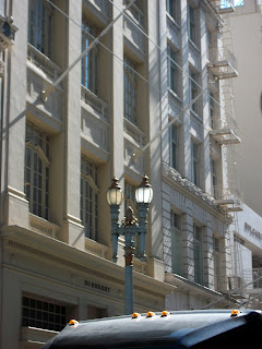 Numa das entradas, um pormenor desconcertante: uma obra de arte de Andy Goldsworthy, a quem pediram algo que relacionasse o edifício com a cidade. Com quem eles se foram meter... O artista agarrou numa serra eléctrica, e avançou pelo pátio novinho em folha, abrindo uma fractura em ziguezague nas belas placas de pedra do chão, continuando pelos blocos enormes ali dispostos. A cidade deitou as mãos à cabeça, "ai o nosso rico museu!" - mas que outra coisa poderia a San Francisco dos terramotos esperar deste especialista do efémero?