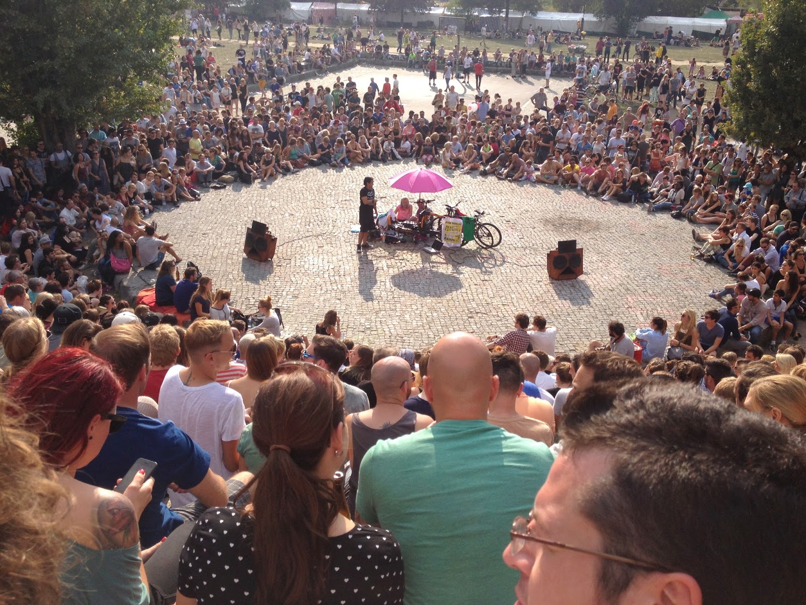 Também havia sol no karaoke do Mauerpark, e o habitual clima, muito berlinense. Vimos um grupo de miúdas que cantava muito mal mas tinha uma onda muito gira, e uma brasileira de Minas Gerais que deu um show fantástico. O Helmut, de Berlim, cantou Die Moritat von Mackie Messer a cappella, e cantou-a melhor que o Brecht propriamente dito, o que - aliás - não é difícil. Um outro trouxe uma canção como quem implora que o ajudem, e deu-me vontade de gritar com urgência "há algum psicólogo no público?", mas limitei-me a aplaudir com entusiasmo, como se faz para todos.